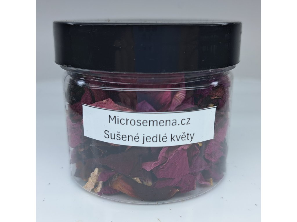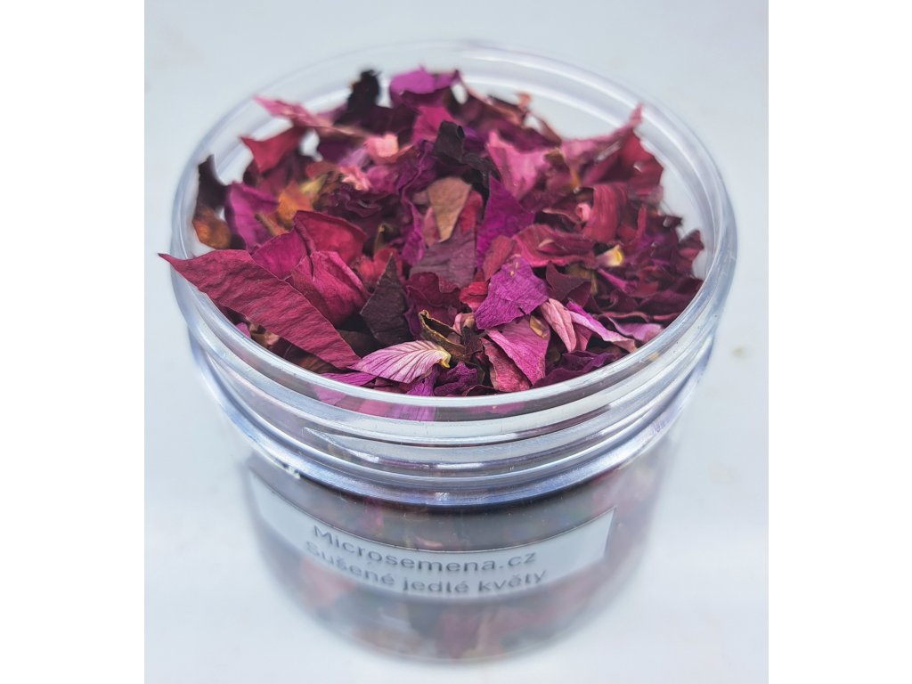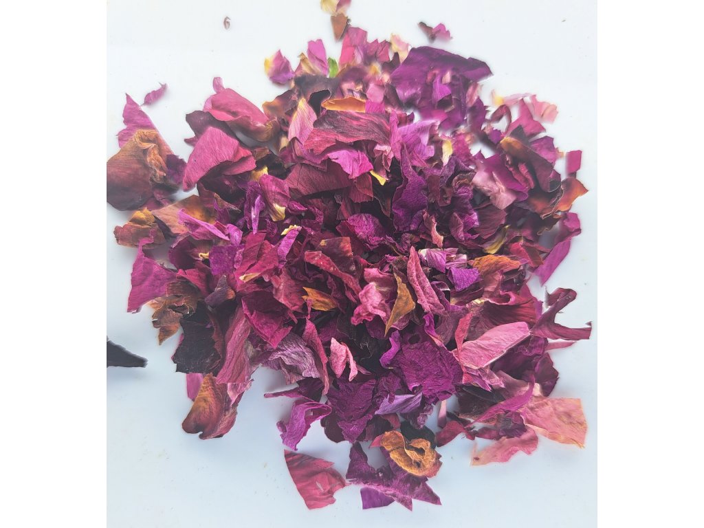 Ručně sbírané okvětní lístky jedlých květů červené růže. Jemně drcené. Určené pro zdobení dortů, dekoraci pokrmů a nápojů.
